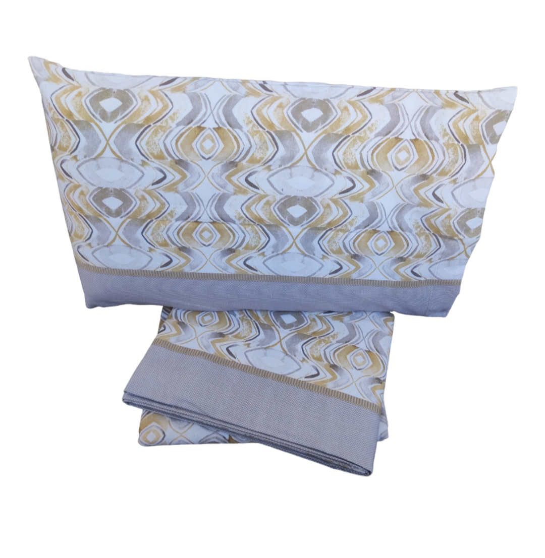 Confezione composta da quattro pezzi: 1 lenzuolo sotto 180x 200+28 cm; 1 lenzuolo sopra 240x290 cm; 2 Federe 52x82 cm ,