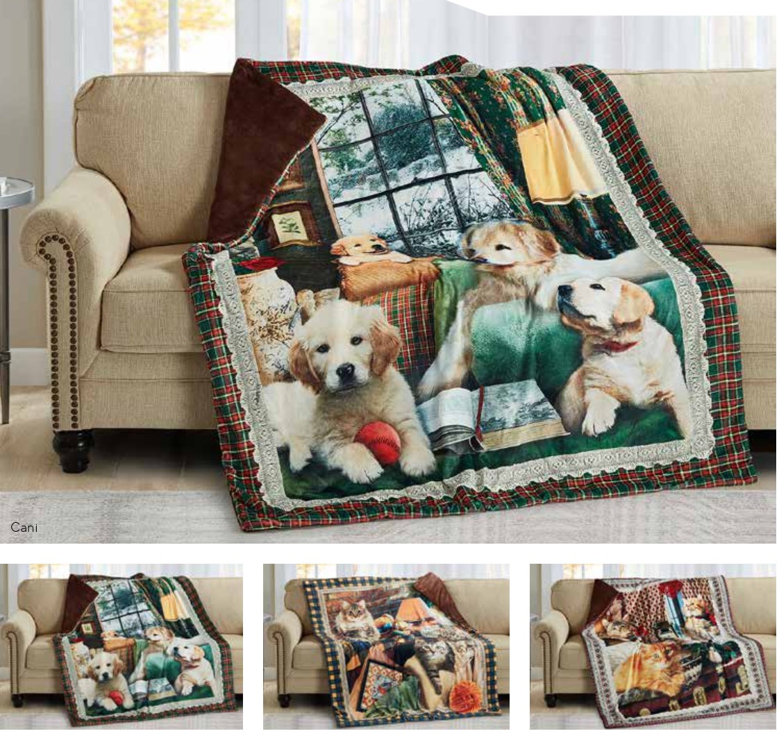Tessuto superiore: velluto 100% poliestere anallergico.Tessuto inferiore: pile coral 100% poliestere anallergico.Doppio strato con retro tinta unita marrone in pile coral.Motivo cani e gatti,