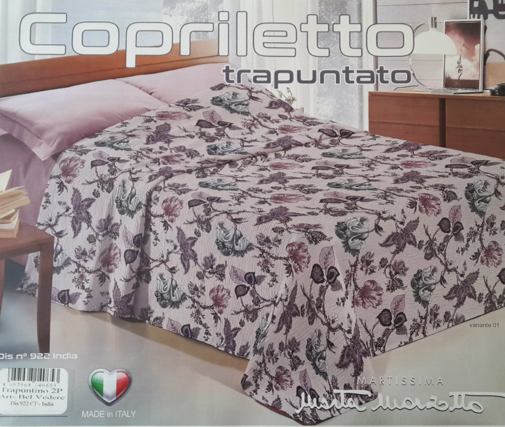 Copriletto matrimoniale Colori: grigio- azzurro- oro- multicolor Caratteristiche: Copriletto trapuntato matrimoniale Marta Marzotto. Lavabile a 30° Made in Italy Dimensioni:260x260 cm