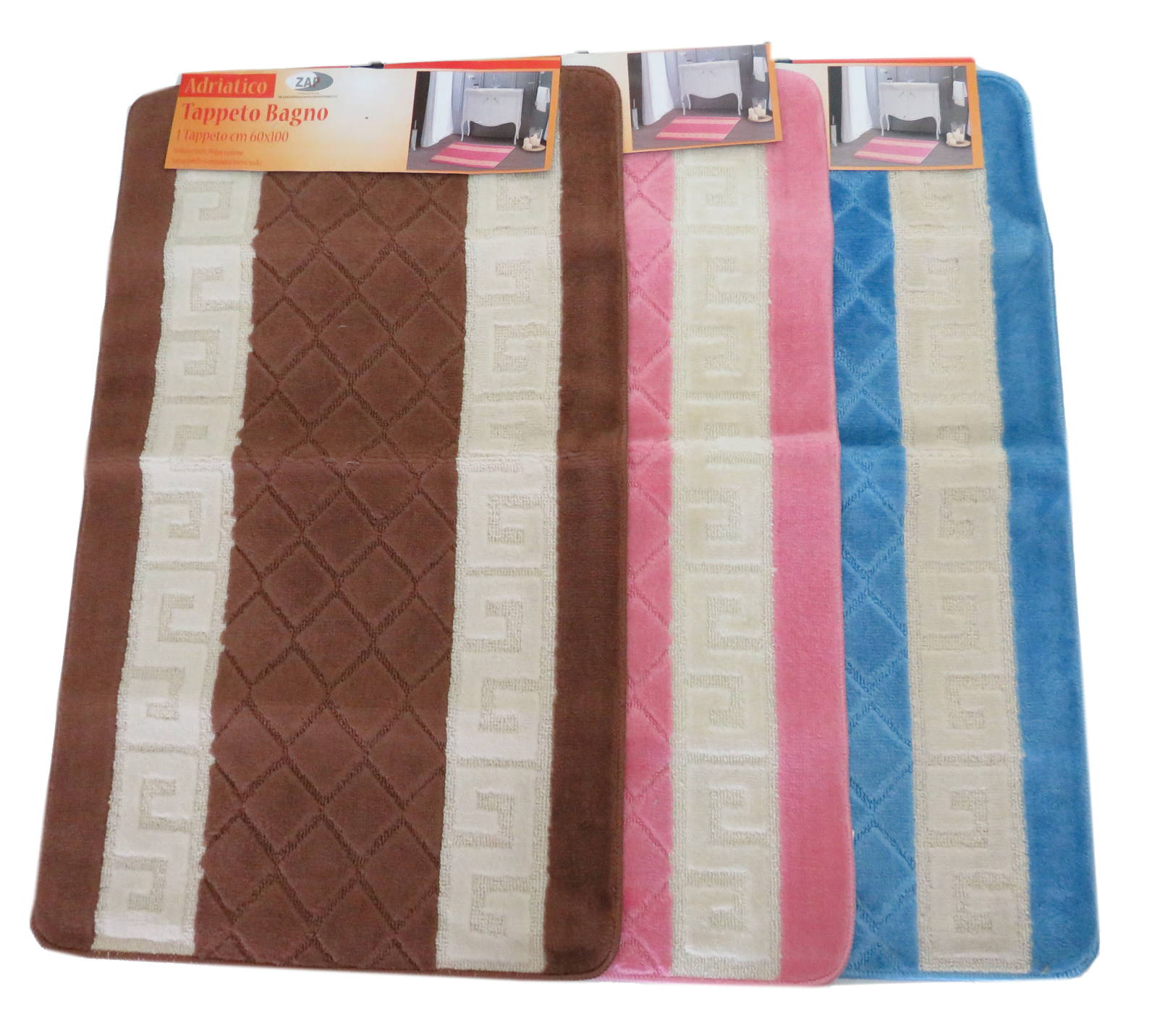 Tappeto bagno Marchio: Emika Colore:Rosa-Marrone-Celeste-Blu Articolo: Adriatico Caratteristiche: Velluto 100% polipropilene.Sotto fondo: gommato antiscivolo. Lavabile a 30° Dimensioni: 60x100