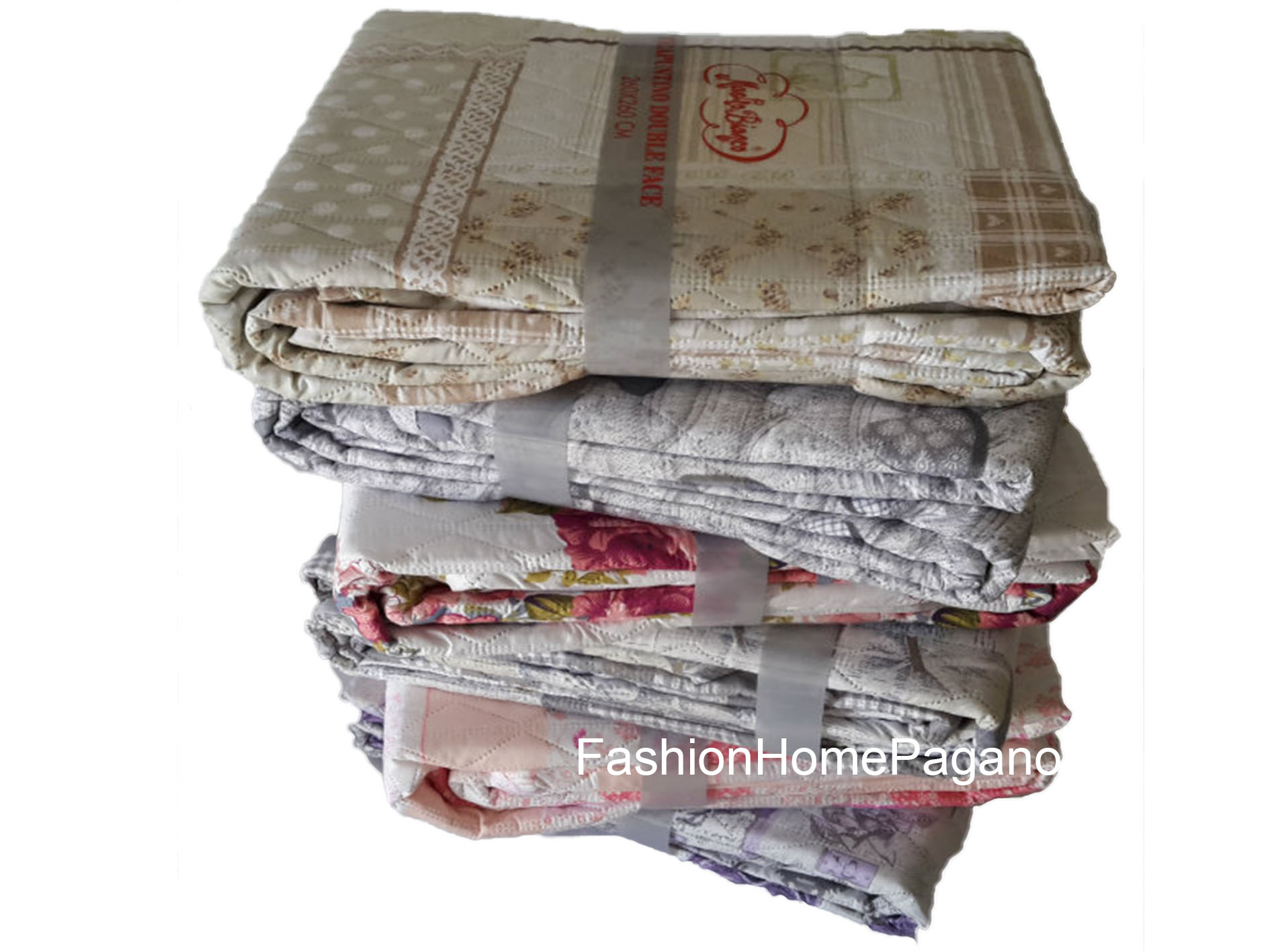 Trapuntino matrimoniale fantasia doubleface Marchio: Mastro Bianco Colore: tortora-begie-rosso-rosa-grigio-verde chiaro-viola Caratteristiche: Cotone in microfibra fantasia doubleface. Lavabile a 30°
